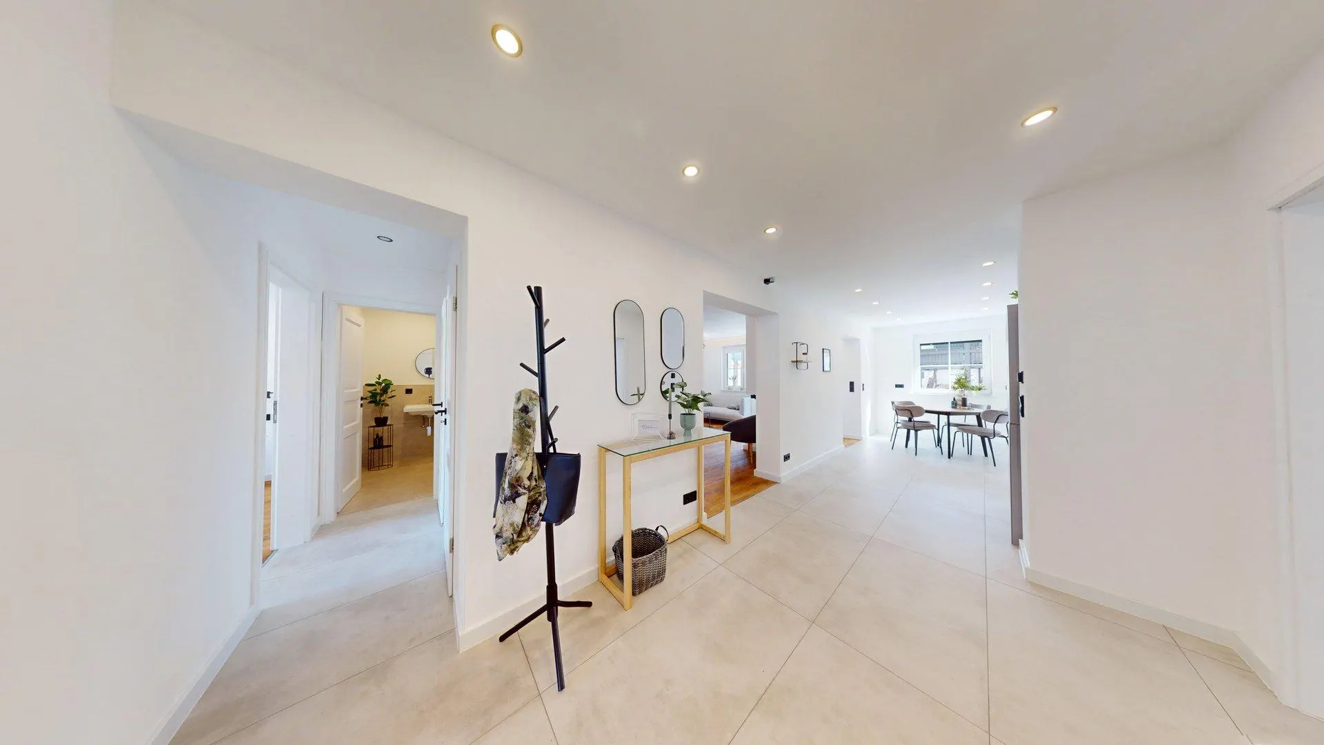 Vom offenen Eingangsbereich mit Garderobe hat man Zugang zu den Schlafzimmern, dem Wohnzimmer, WC und Bad.