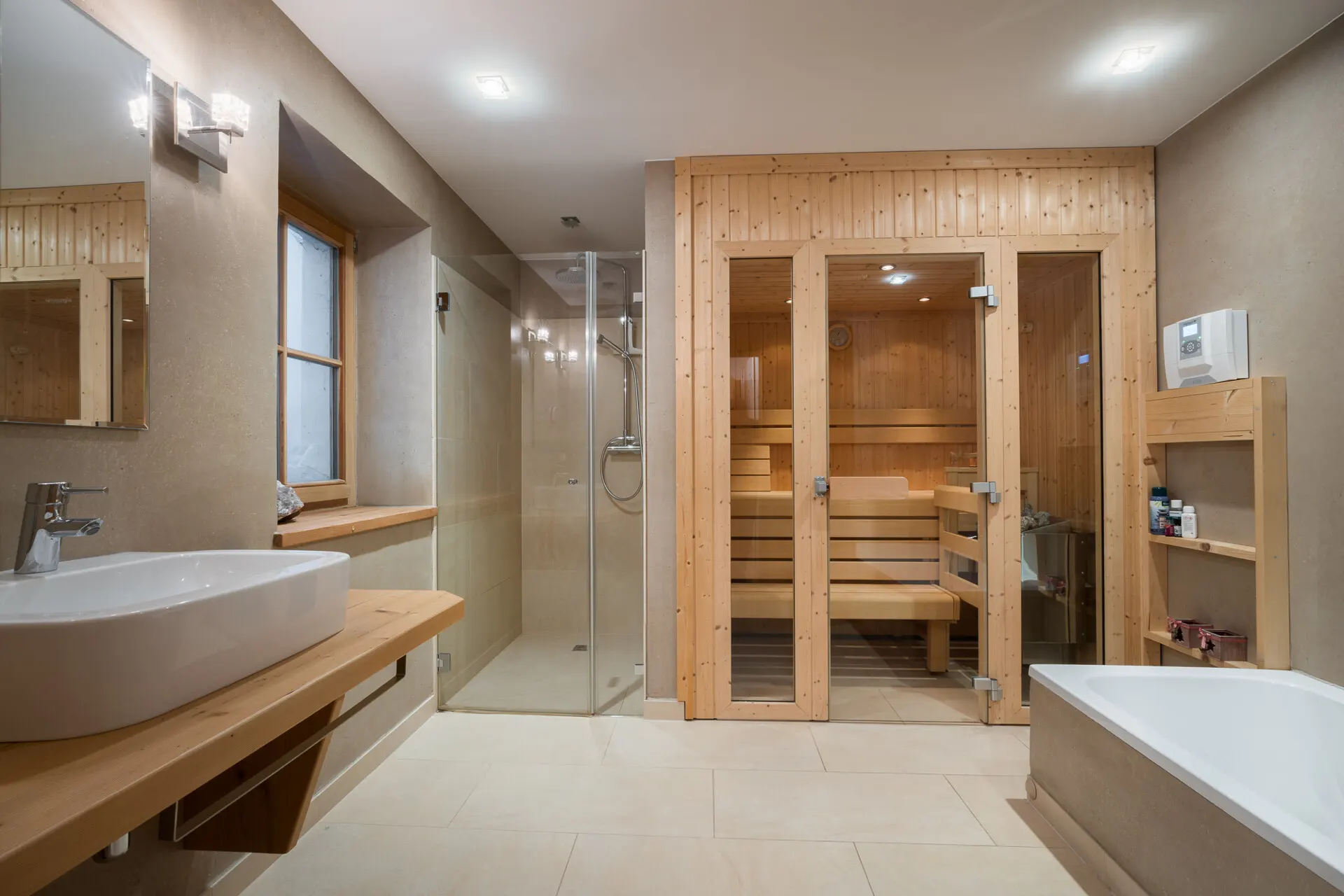 Im unteren der beiden Geschosse empfängt Sie ein einladender Eingangsbereich. Hier befinden sich drei komfortable Schlafzimmer. Zwei stilvolle Badezimmer, eines davon en-Suite. Das zweite Badezimmer ist mit einer entspannenden Sauna ausgestattet, die zum Wohlfühlen einlädt. Jedes Schlafzimmer bietet direkten Zugang zum ruhigen Gartenbereich.