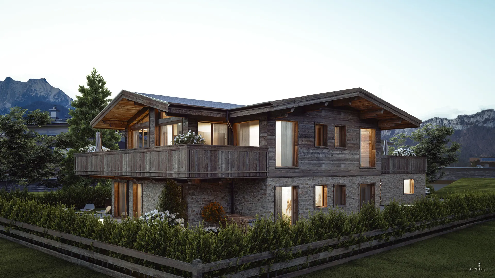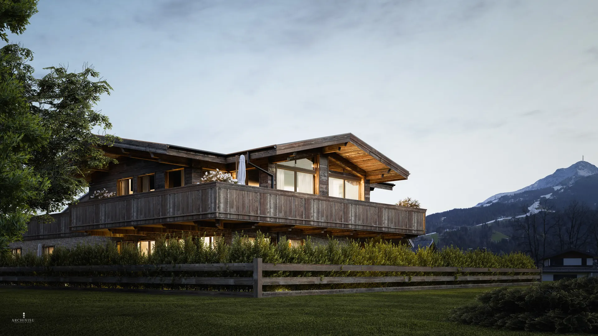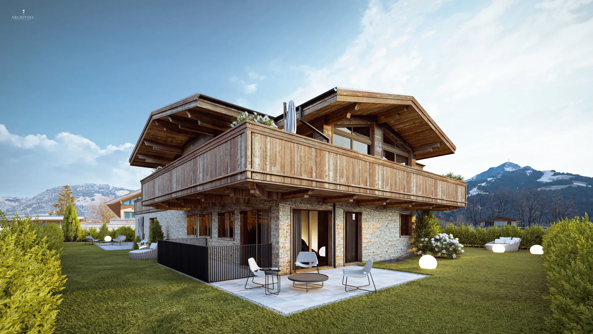 Der großzügige Wohnbereich mit Küche und Esszimmer ist im Dachgeschoss vorgesehen. Die weitläufigen Terrassen bieten Platz, um die Sonne und den atemberaubenden Blick auf den Wilden Kaiser und das Kitzbüheler Horn zu genießen. Zudem ist auf dieser Ebene ein Büro oder Schlafzimmer mit eigenem Bad geplant.