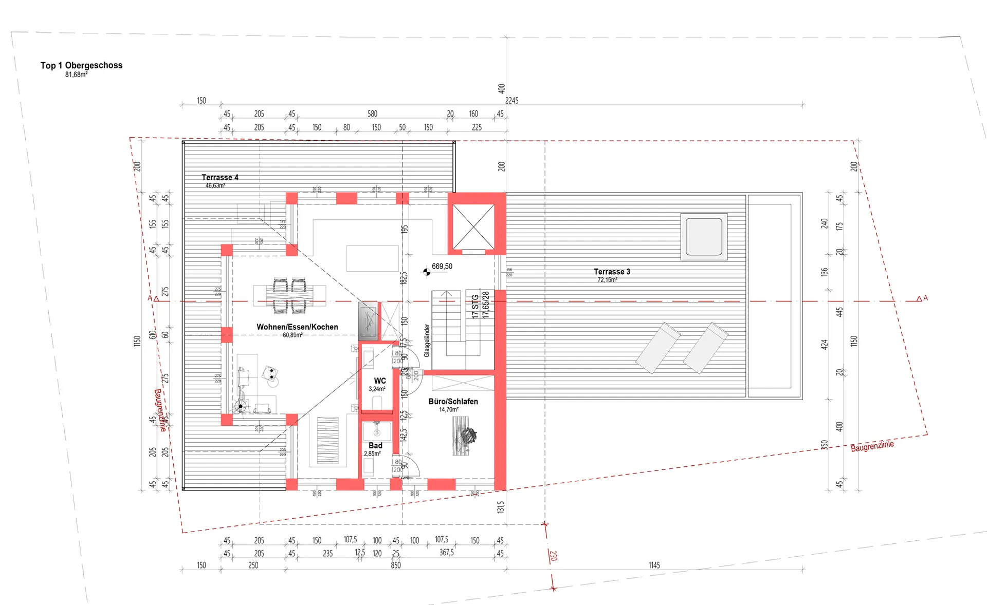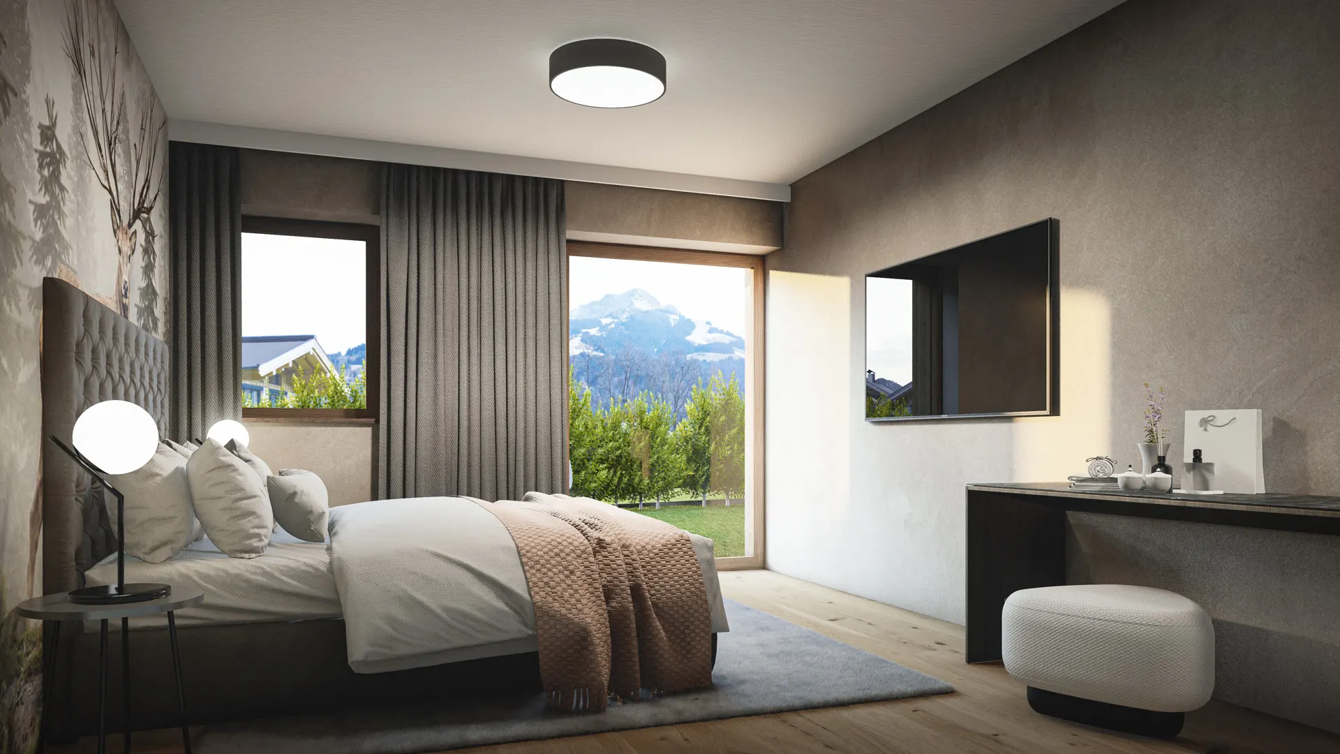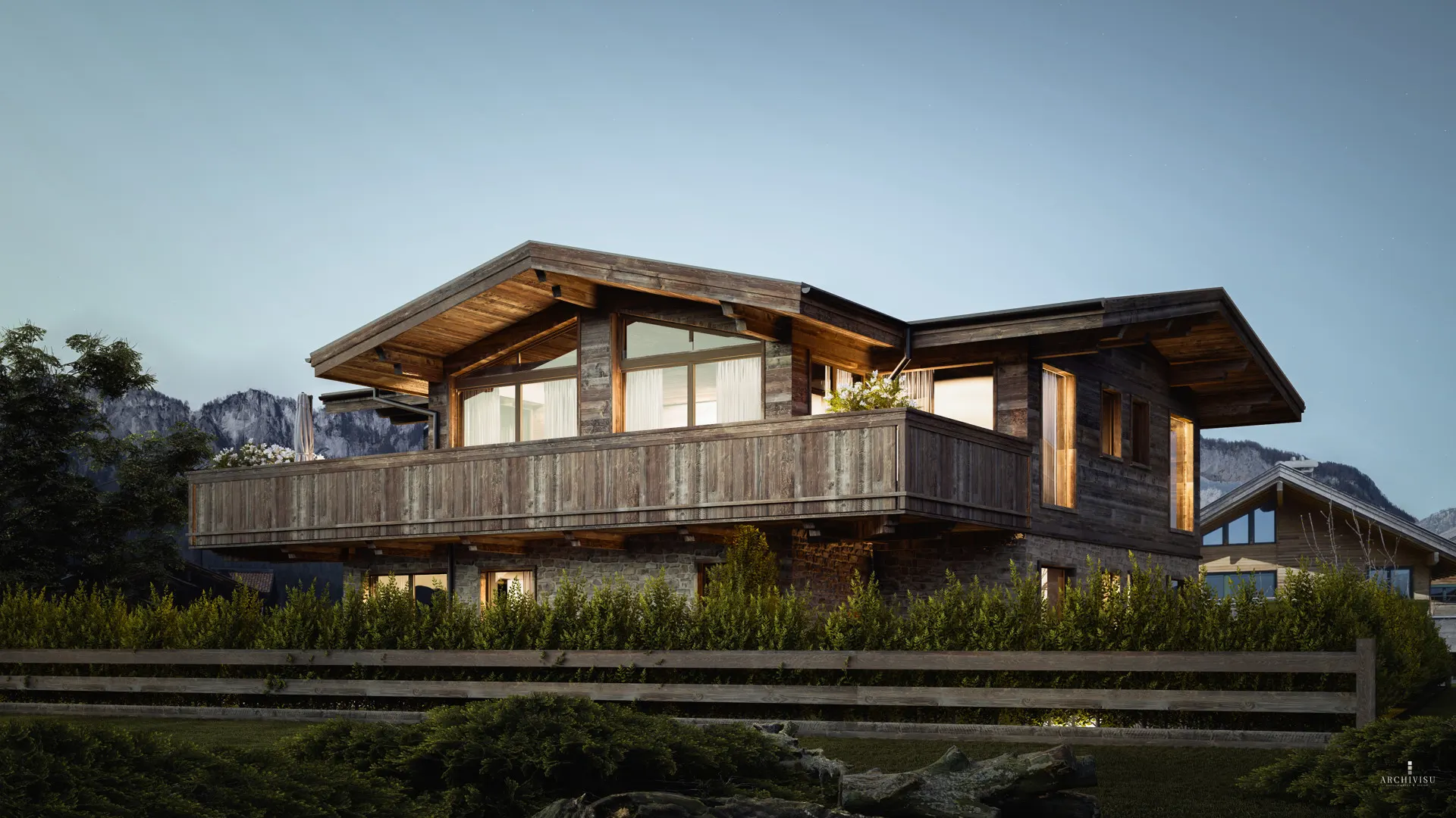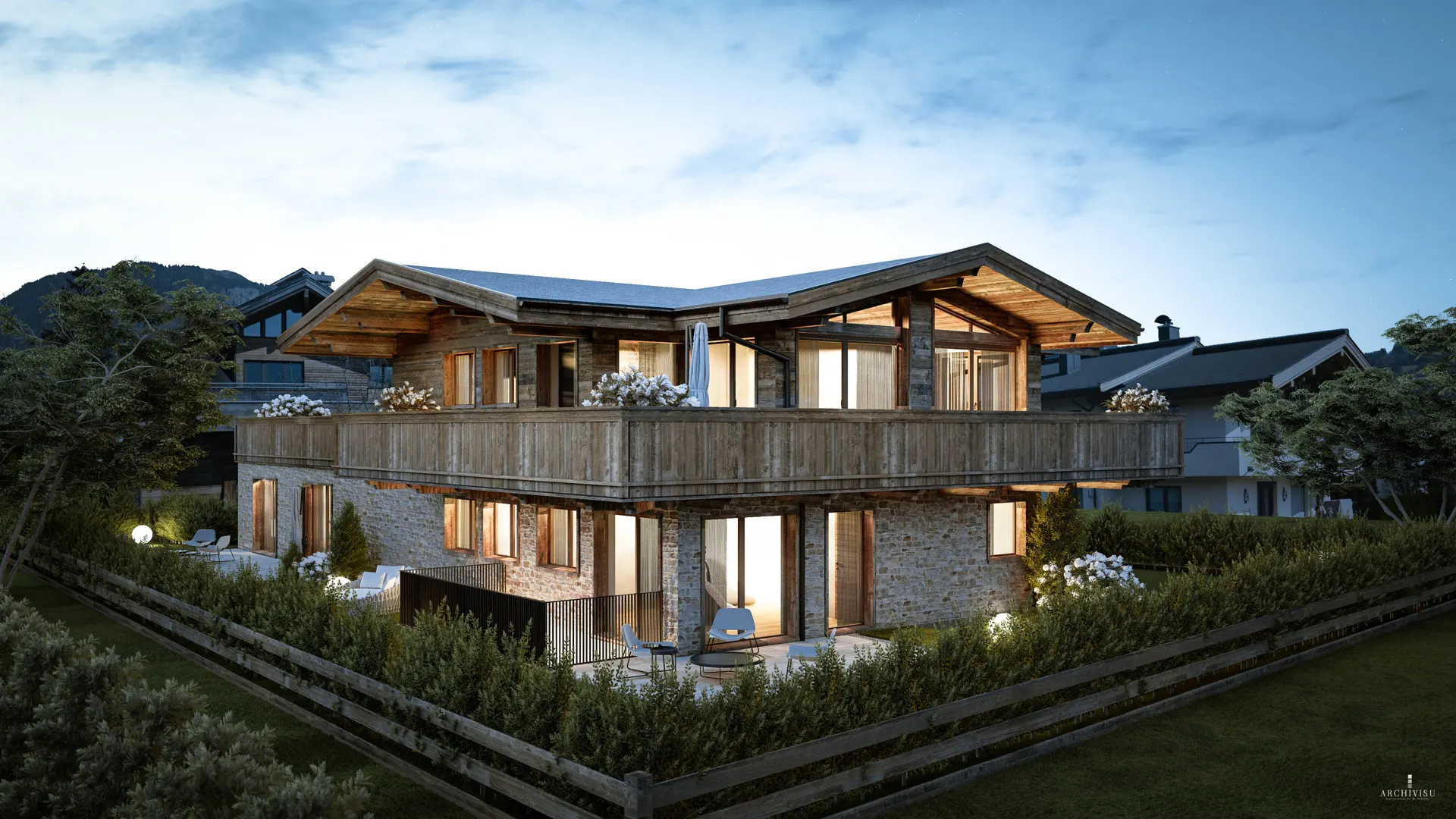 Der großzügige Wohnbereich mit Küche und Esszimmer ist im Dachgeschoss vorgesehen. Die weitläufigen Terrassen bieten Platz, um die Sonne und den atemberaubenden Blick auf den Wilden Kaiser und das Kitzbüheler Horn zu genießen. Zudem ist auf dieser Ebene ein Büro oder Schlafzimmer mit eigenem Bad geplant.