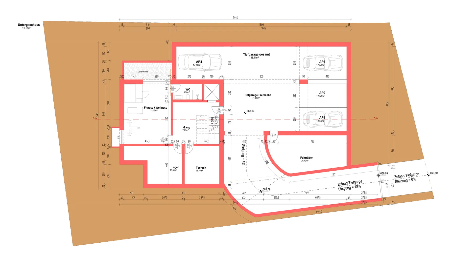 Das Untergeschoss beinhaltet neben Technik- und Lagerräumen auch einen Fitnessraum mit Bad und einen Lichthof.