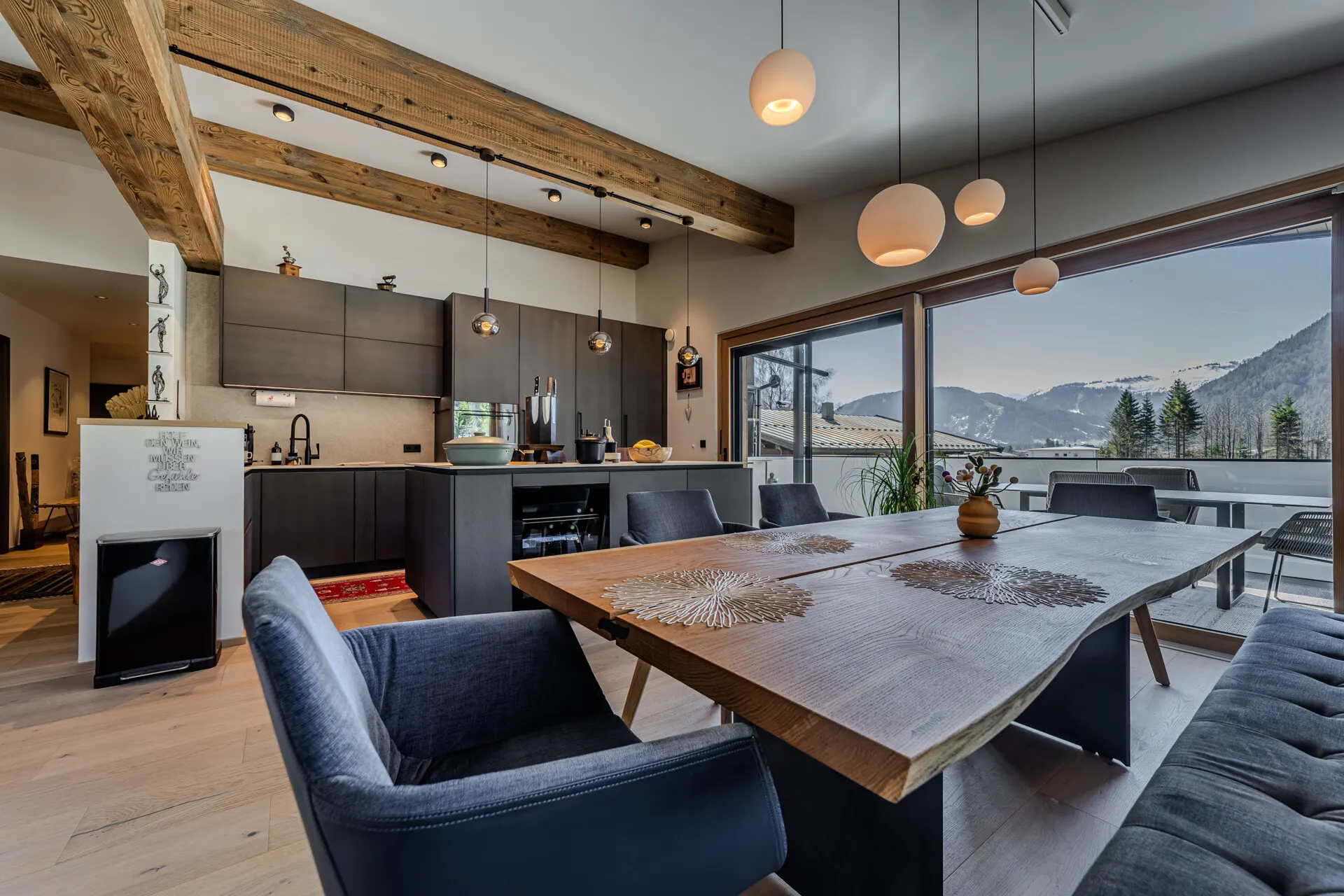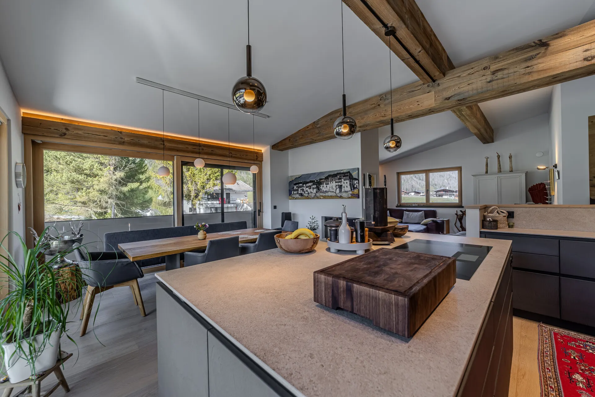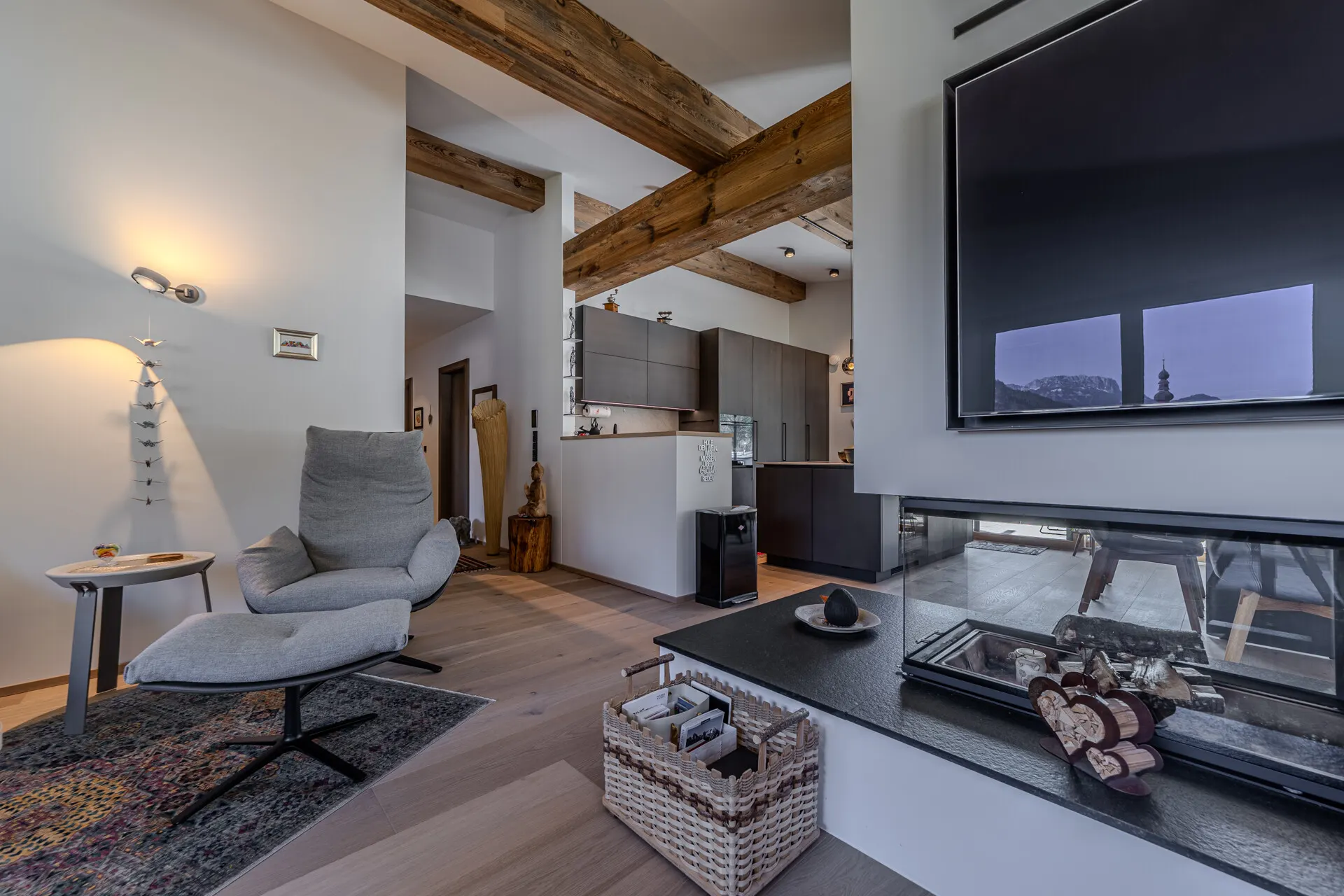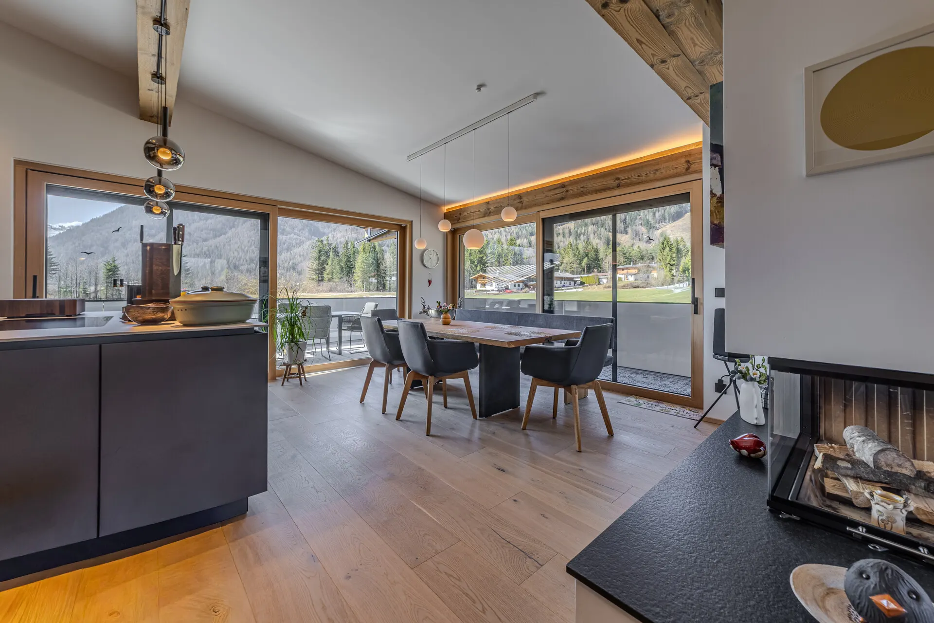 Die ausgestattete Wohnung verfügt über eine Wohn-, Ess-, Kochbereich, der durch einen offenen Kamin getrennt wird. Die Küche wurde von der Küchenschmiede entworfen und mit besten Materialien als auch Geräten ausgestattet.