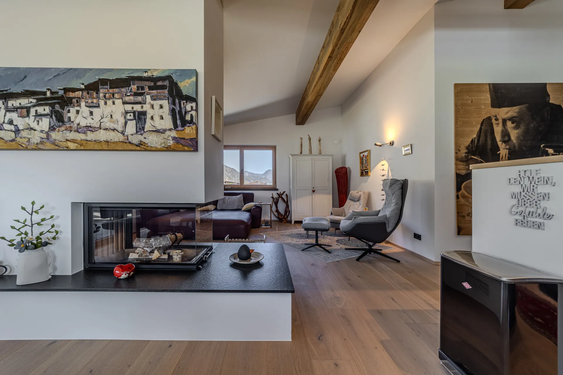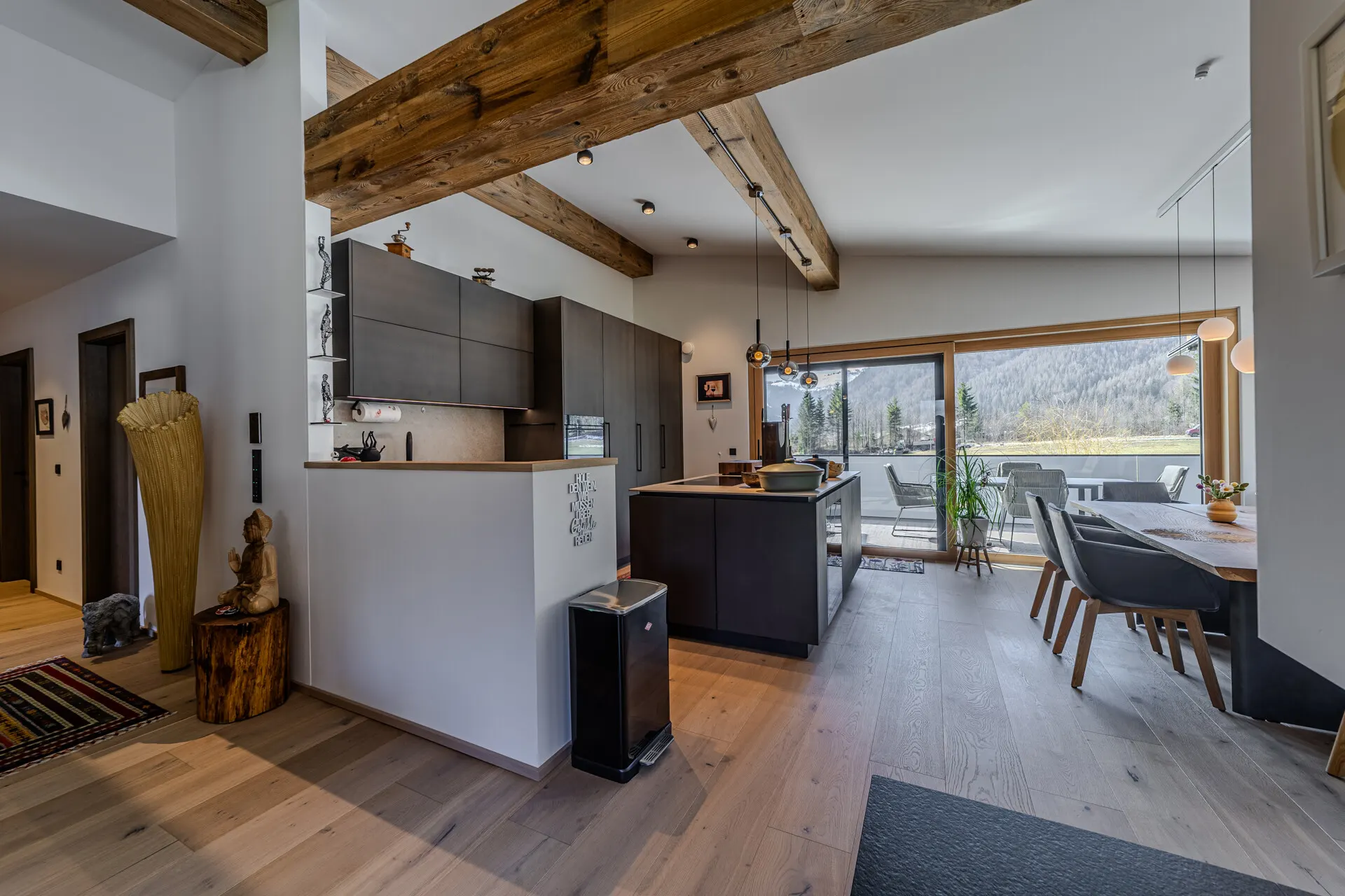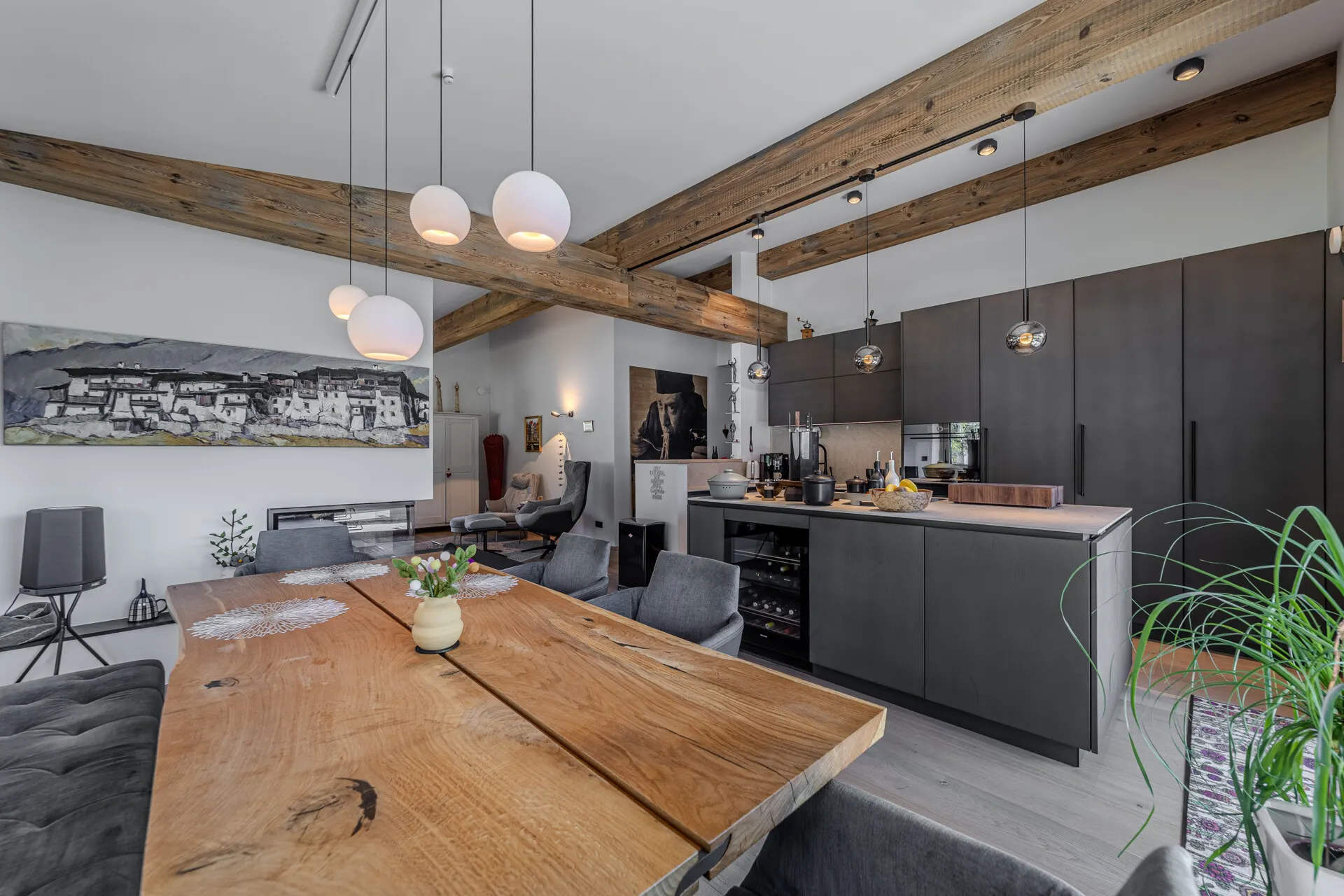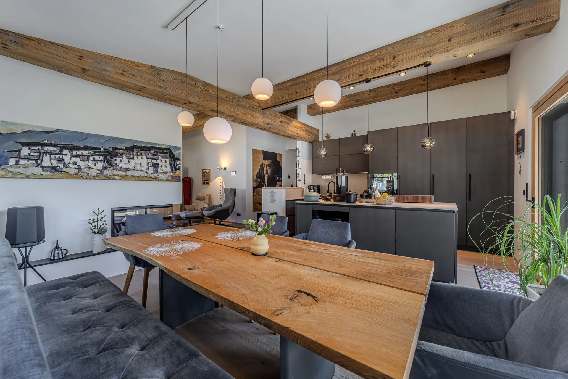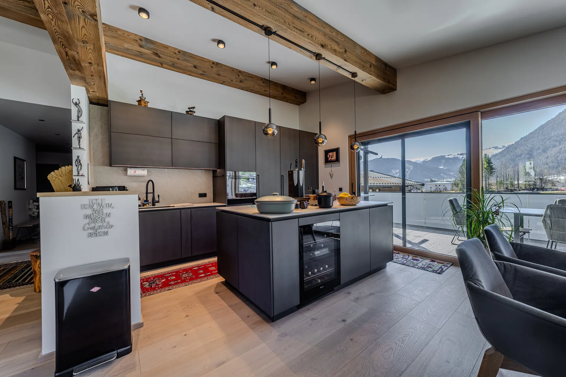 Die ausgestattete Wohnung verfügt über eine Wohn-, Ess-, Kochbereich, der durch einen offenen Kamin getrennt wird. Die Küche wurde von der Küchenschmiede entworfen und mit besten Materialien als auch Geräten ausgestattet.