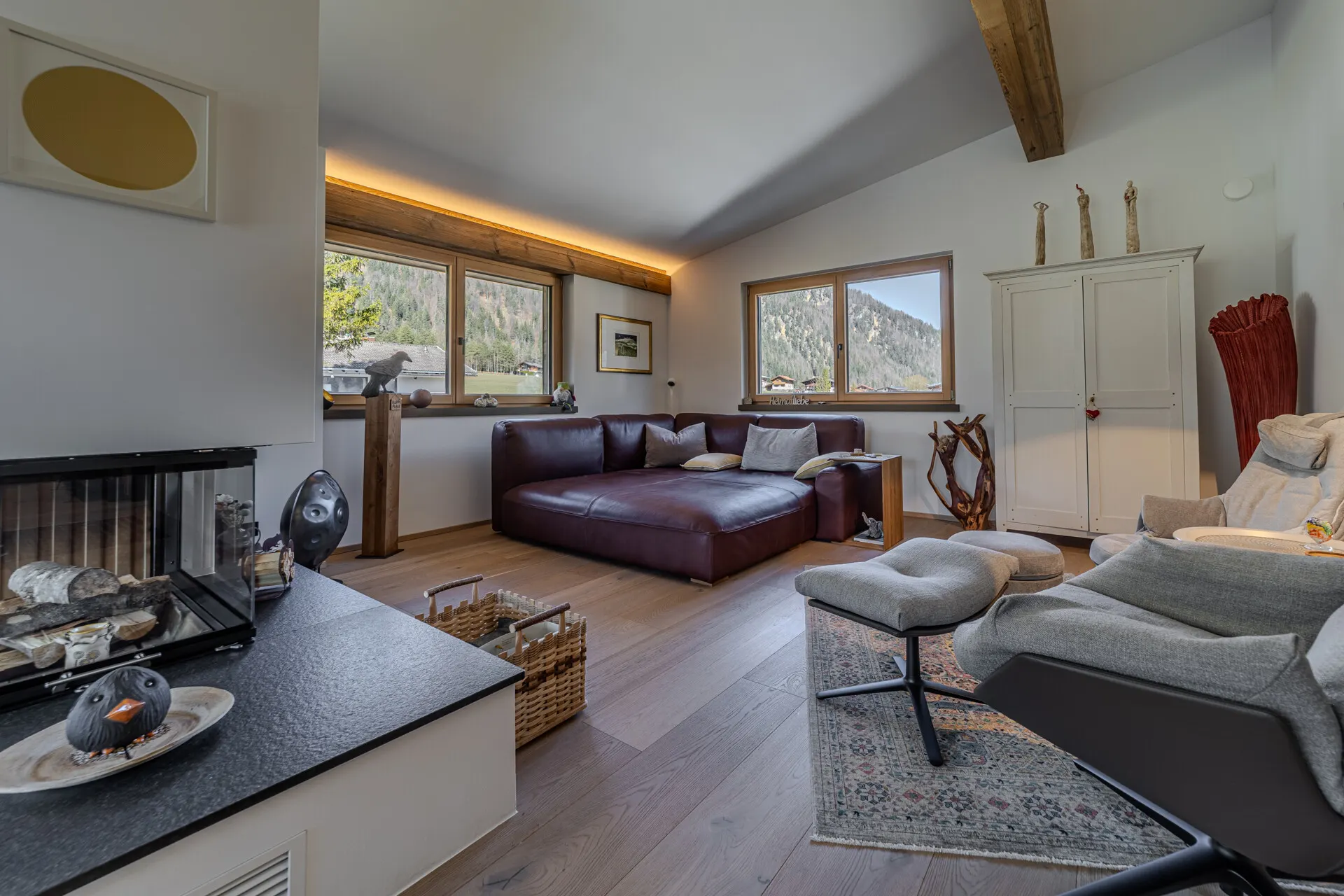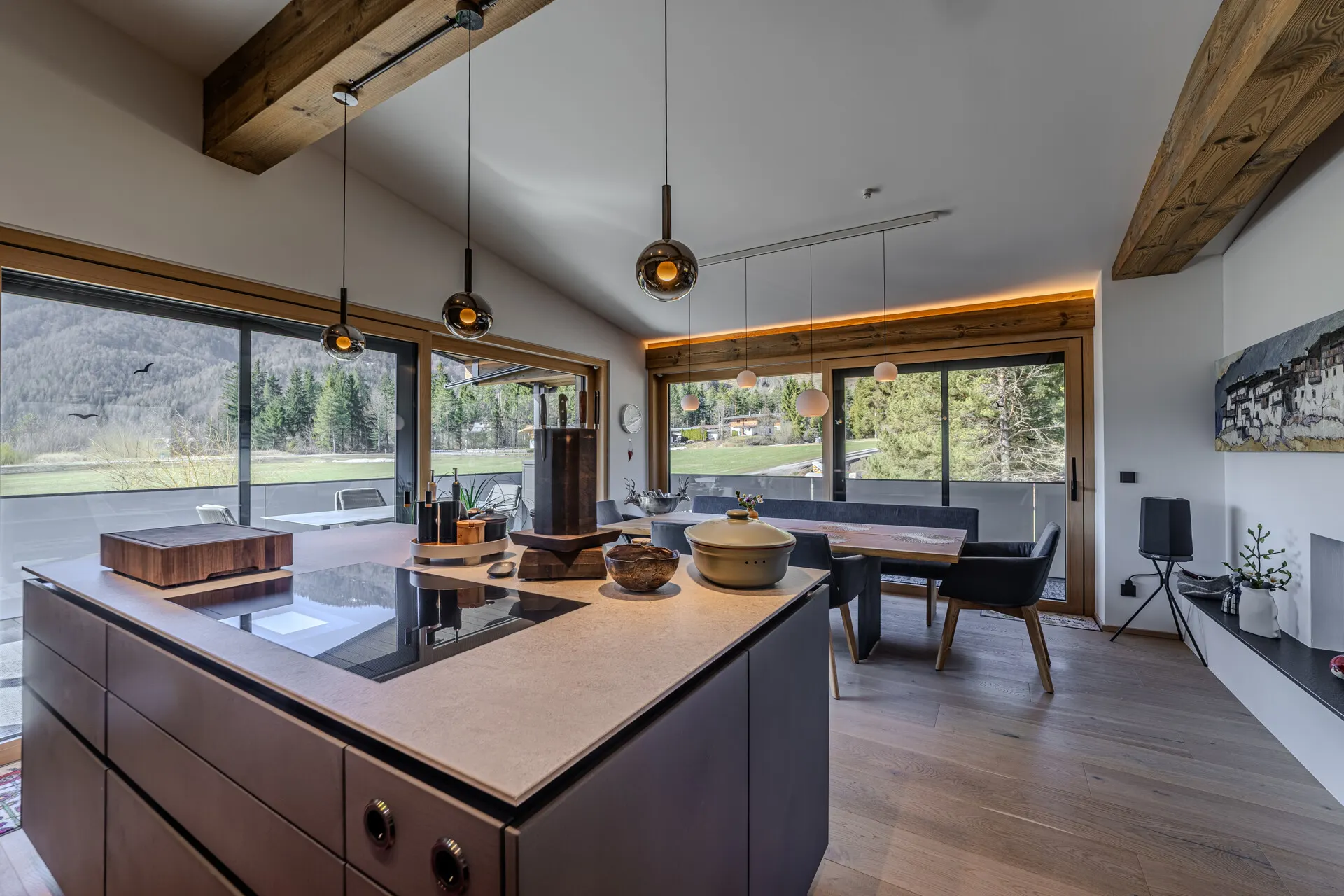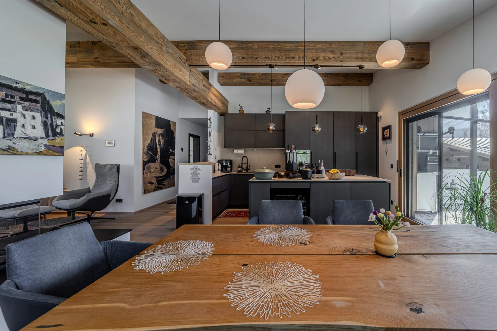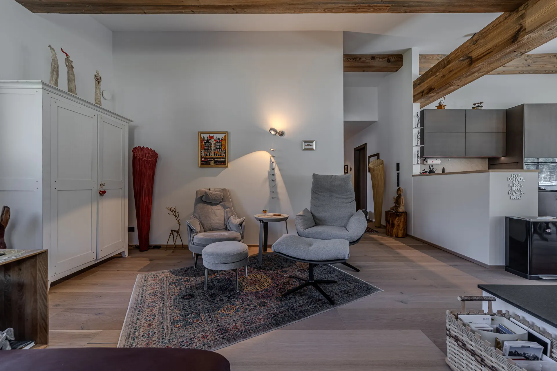 Die ausgestattete Wohnung verfügt über eine Wohn-, Ess-, Kochbereich, der durch einen offenen Kamin getrennt wird. Die Küche wurde von der Küchenschmiede entworfen und mit besten Materialien als auch Geräten ausgestattet.
