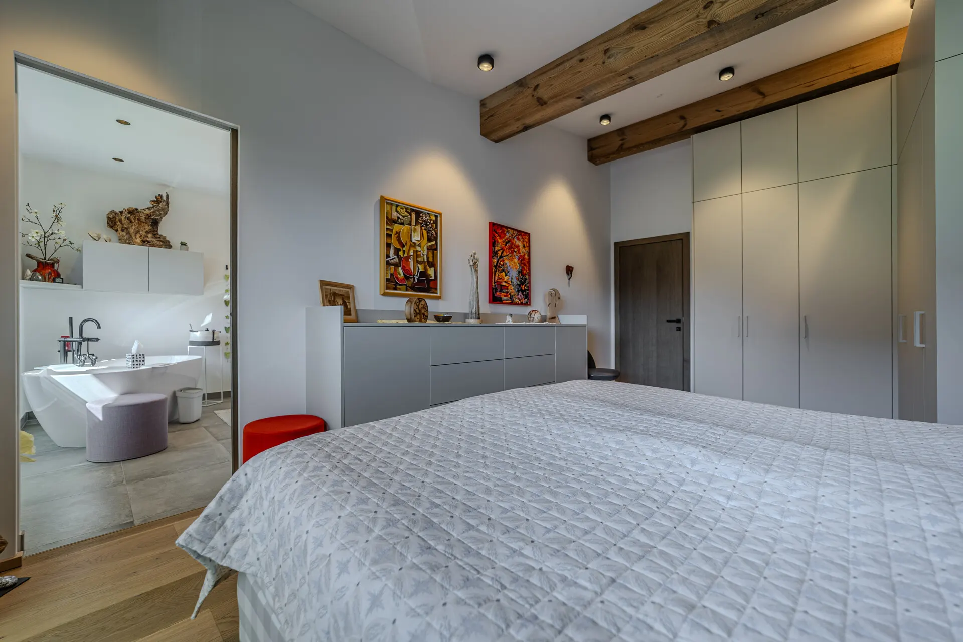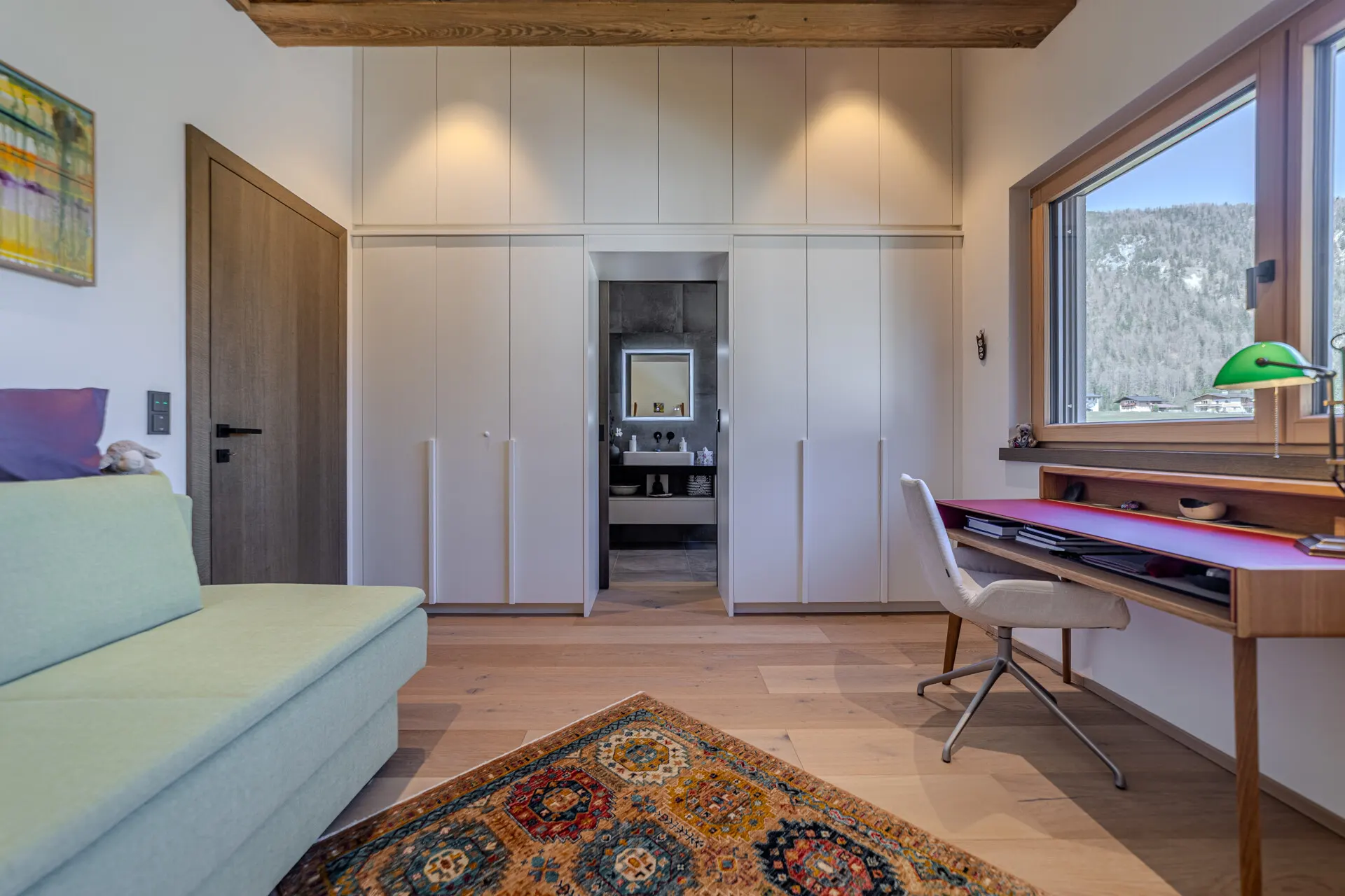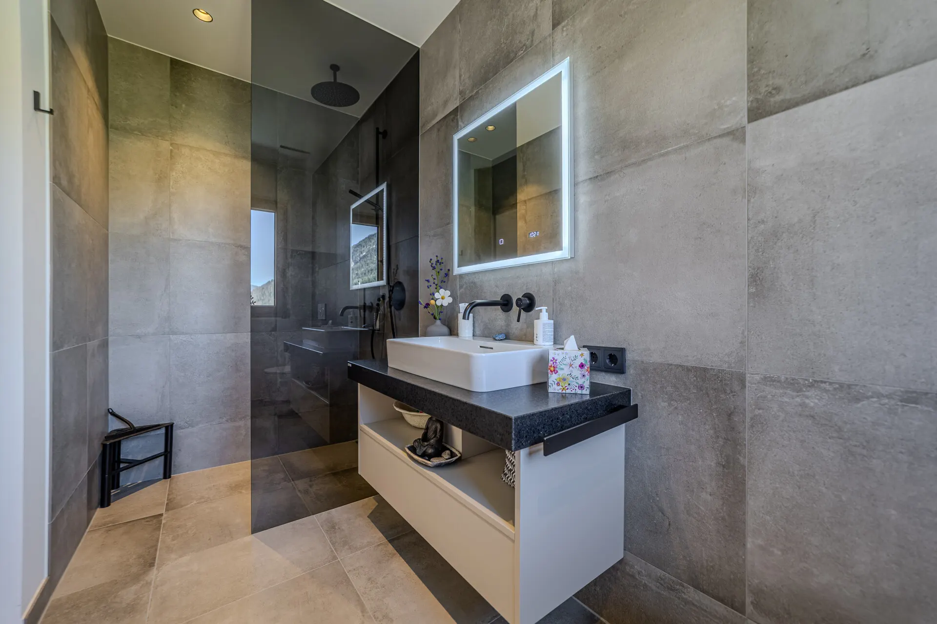 Die beiden Schlafzimmer verfügen jeweils über ein Bad en Suite, wobei das Gästezimmer auch als Büro genutzt wird.